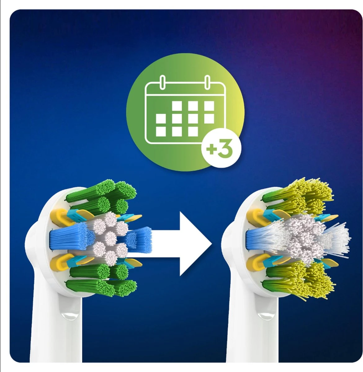 Tandartsen bevelen aan om uw opzetborstel om de drie maanden te vervangen. De verbeterde FlossAction opzetborstels van Oral-B zijn uitgerust met CleanMaximiser borsteltechnologie die groene borstelharen geel maakt om u eraan te herinneren wanneer u deze moet vervangen om een superieure reiniging te behouden.*