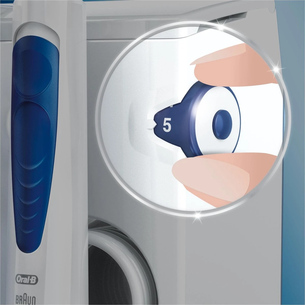 - De spiraalvormige waterstromen met microbubbels masseren zacht het tandvlees. Je kunt de waterdruk naar je behoeftes aanpassen van 1 (lage druk) tot 5 (hoge druk)